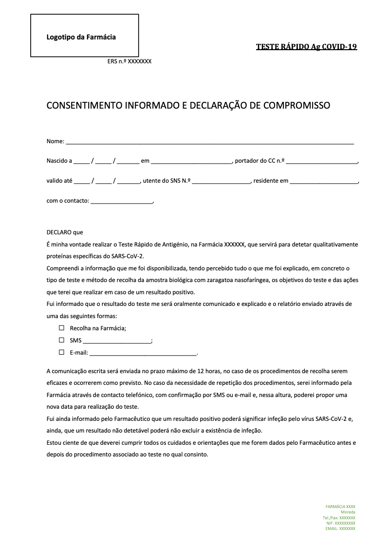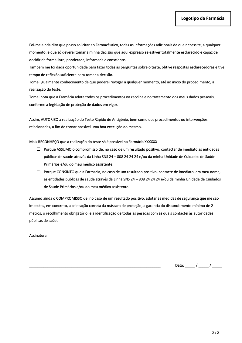 • Assinatura do consentimento informado em como autoriza a realização do teste e, atesta que recebeu toda a informação sobre o teste a realizar.
