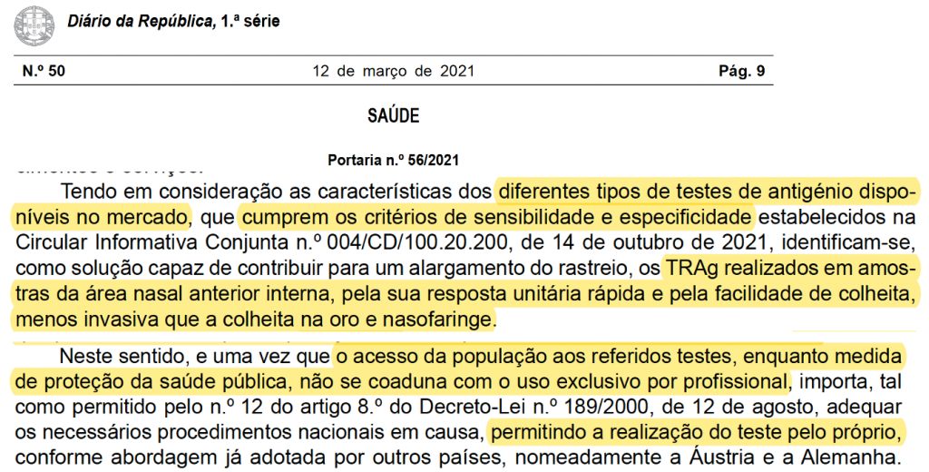 A portaria nº56/2021, de 12 de Março estabelece um regime excecional e temporário para a realização em autoteste de testes rápidos de antigénio, destinados, pelos seus fabricantes, a serem realizados em amostras da área nasal anterior interna.