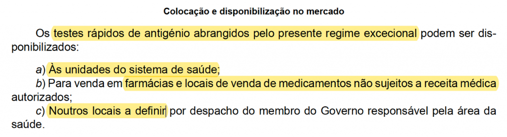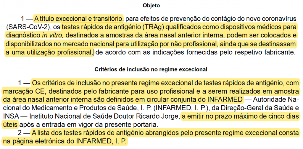 Considerando que, à data, todos os TRAg colocados no mercado europeu são destinados pelo seu fabricante a uso profissional, após observância dos correspondentes procedimentos de avaliação de conformidade, a sua utilização por leigos carece de uma autorização por parte do INFARMED, I.P. enquanto Autoridade Competente para dispositivos médicos de diagnóstico in vitro.