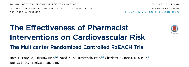 • Tsuyuki RT, Al Hamarneh YN, Jones CA, Hemmelgarn BR. The Effectiveness of Pharmacist Interventions on Cardiovascular Risk: The Multicenter Randomized Controlled RxEACH Trial. J Am Coll Cardiol. 2016 Jun 21;67(24):2846-54