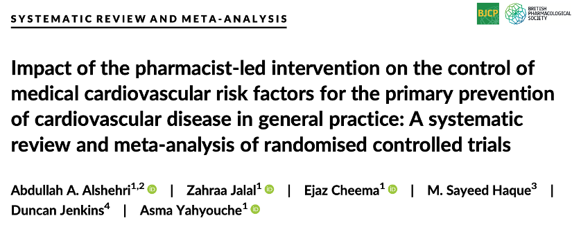 • Alshehri AA, Jalal Z, Cheema E, Haque MS, Jenkins D, Yahyouche A. Impact of the pharmacist-led intervention on the control of medical cardiovascular risk factors for the primary prevention of cardiovascular disease in general practice: A systematic review and meta-analysis of randomised controlled trials. Br J Clin Pharmacol. 2020 Jan;86(1):29-38.